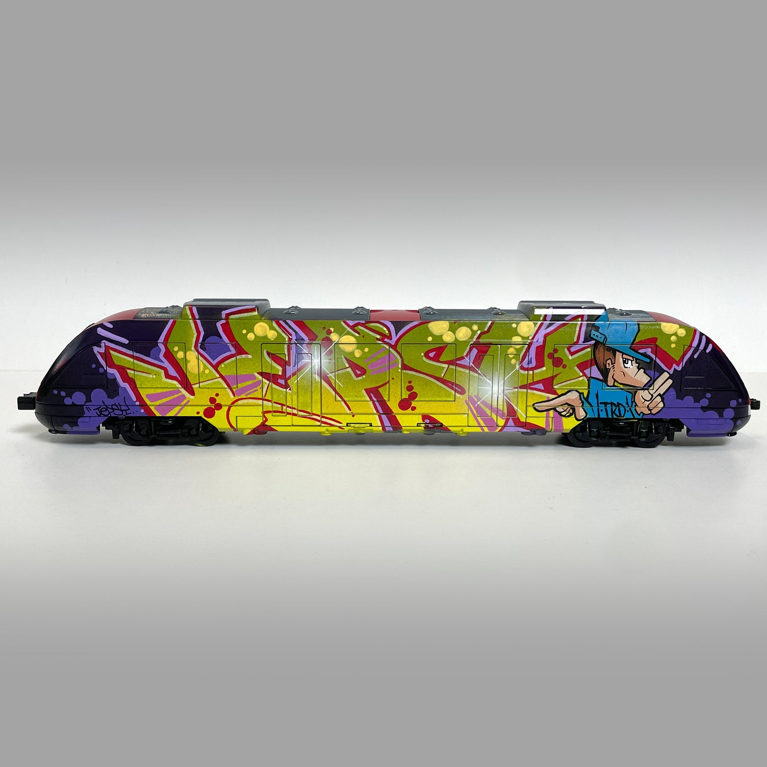 Handbemalter Nahverkehrszug in einer individuell gestalteten Verpackung.
