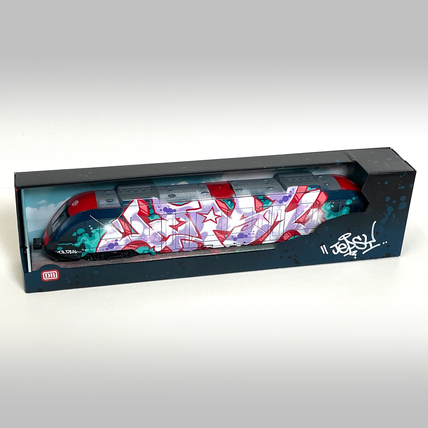 Handbemalter Nahverkehrszug in einer individuell gestalteten Verpackung.