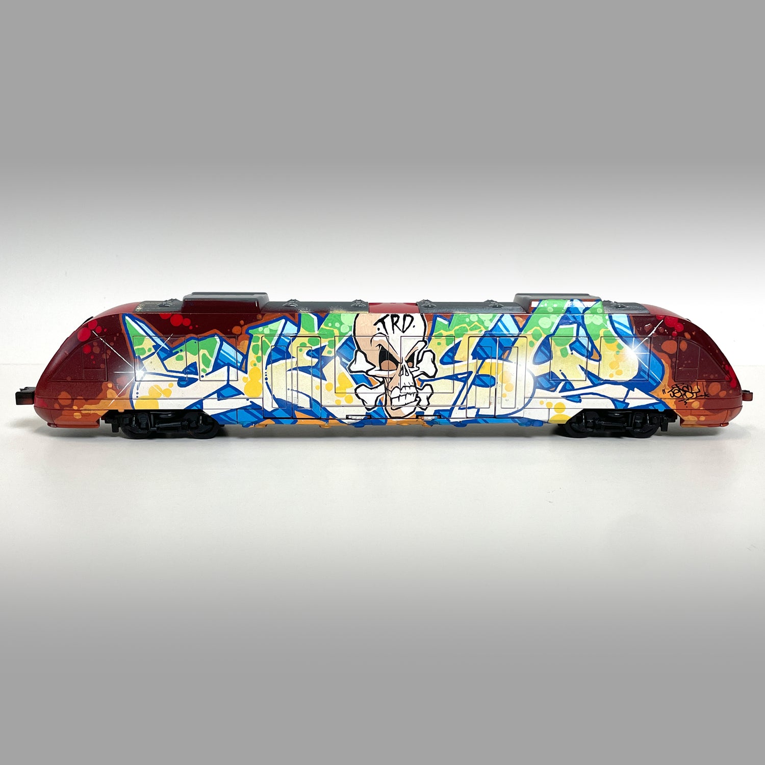 Handbemalter Nahverkehrszug in einer individuell gestalteten Verpackung.